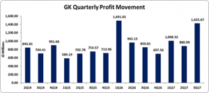Pre-tax profits decreased 1% to approximately $4.94 billion, compared to pre-tax profit of $5.00 billion documented for the first nine months of 2016. GK incurred taxation expenses amounting to approximately $1.18 billion compared to $1.30 billion in September 2016. Consequently, net profit increased by 1% to $3.75 billion from $3.70 billion booked for the first nine months of 2016. Net profit for the quarter increased 57% to total $1.57 billion relative to $998.25 million reported in 2016.