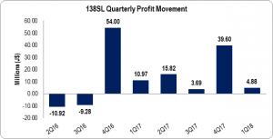 138SL’s Income increased by 77% to $191.63 million relative to the $108.04 million recorded for the comparable period the prior year. The company noted that, “Revenue for the current quarter to December 31, 2017 was not at its optimum and was lower than expectations. Other Operating Income rose 3% to $7.27 million (2016: $7.06 million) for the period in review. As such, total income for the quarter amounted to $198.90 million compared to $115.11 million booked in 2016.