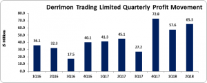 Derrimon Trading Limited (DTL) Trading Income climbed by 33%, to end the six months at $4.04 billion compared to the $3.05 billion for the prior period. For the quarter the company reported a 38% increase in Trading Income totalling $2.10 billion relative to $1.52 billion. Management noted, “The six months (6) revenue from the Distribution and Retail segment was $3,830.119 billion which was $986.631 million or 34.70% over the $2,843.488 billion reported for the corresponding six (6) months period in 2017. For the second quarter ending June 2018, revenue generated was $1,979.822 billion representing a growth of $574.513 million or 40.88% over the similar period in 2017.”