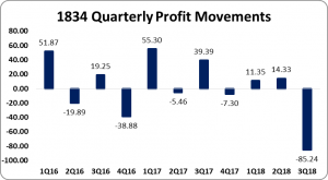 Tax charges of $2.60 million were incurred for the nine months period compared to $15.33 million reported in 2017. As such, the loss for the period amounted to $59.56 million relative to profit of $89.23 million for the prior year. For the quarter, 1834 posted net loss of $85.24 million versus a net profit of $34.37 million in the previous corresponding quarter.