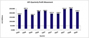 AFS reported profit before taxation of $428.43 million for the period relative to $379.54 million recorded in 2017. Following a taxation amount of $32.81 million (2017: $33.15 million), AFS booked a profit for the period of $395.62 million, a 14% increase relative to the $346.38 million recorded for the comparable period in 2017. Profit for the quarter totalled $178.90 million, 13% higher than the $158.13 million reported in 2017.