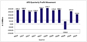 Interest expense charged for the period totalled $103.20 million, a 113% increase compared with the $48.54 million booked in 2018. This resulted in AFS booking a net interest income of $727.55 million for the period, 2% less than the $738.73 million in 2018.
