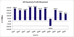 AFS reported a profit before taxation of $407.66 million relative to $652.49 million in 2018. AFS booked a profit for the period of $368.50 million (2018: $583.68 million), after tax charges of $39.15 million (2018: $68.81 million). Net profit for the quarter amounted to $88.87 million compared to a profit of $188.07 million booked for the comparable quarter of 2018. The Company noted, “This represents a 37% decline in net profit year over year which is attributable to lower interest margins and increase allowances for credit losses in keeping with the significant growth in the loan portfolio. The results for the period was also impacted by increased income taxes as the 10-year Junior Market tax concession, has expired. In addition, it includes the consolidation of the performance of Embassy Loans Inc. (Embassy Loans), which was acquired on December 15, 2018.”