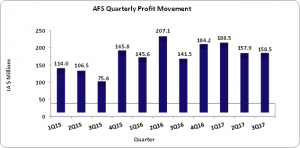 AFS reported a profit before taxation of $559.66 million relative to $539.87 million in 2016. AFS booked a profit for the period of $504.85 million (2016: $494.23 million), after tax charges of $54.81 million (2016: $45.67 million). Net profit for the quarter amounted to $158.49 million compared to $141.55 million booked for the comparable quarter of 2016.