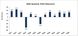 Earnings per share for the period amounted to $0.028 (2018: $0.031). The twelve month trailing EPS amounted to $0.11. The number of shares used in our calculations amounted to 511,894,285 units. Notably, AMG’s stock price closed the trading period on January 13, 2020 at a price of $2.20.