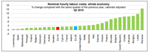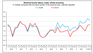 According to Eurostat, the statistical office of the European Union, “Hourly labour costs rose by 2.2% in the Euro Area (EA19) and by 2.9% in the EU28 in the second quarter compared with the same quarter of the previous year. In the first quarter of 201, hourly labour costs increased by 2.1% and 2.8%, respectively.”