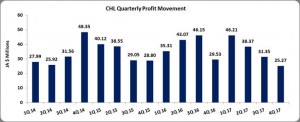 As such, Operating Profit declined year over year by 7% from $176.93 million in 2016 to $163.79 million, while for the quarter there was a 16% contraction from $34.50 million to $29.12 million. Finance costs rose 93% to close at $1.33 million (2016: $691,029), while interest income rose 4% to $2.47 million on from $2.36 million in 2016. Additionally, CHL booked loss on exchange of $1.66 million compared to nil in 2016.