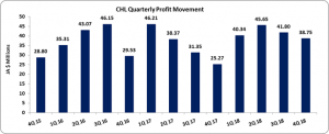 Consequently, earnings per share (EPS) for the 2018 financial year amounted to $0.40 (2017: $0.34), while EPS for the quarter amounted to $0.09 (2017: 0.06). The numbers of shares used in the calculations are 416,250,000 units. CHL closed the trading period on November 13, 2018 at a price of $13.00