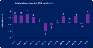The index for the divisions ‘Furnishings, Household Equipment & Routine Household Maintenance’ and ‘Health’ each recorded an increase of 0.2% in its index for the month of July 2019. The movement in the index ‘Furnishings, Household Equipment & Routine Household Maintenance’ resulted from upward movements in the groups ‘Furniture and Furnishings (including Floor Coverings)’, ‘Tools and Equipment for House and Garden’, ‘Goods and Services for Routine Household Maintenance’, each recording increases of 0.2% and ‘Household Textiles’, ‘Household Appliances’ and ‘Glassware, Tableware and Household Utensils’, each recording increases of 0.1%. The increase within the division ‘Miscellaneous Goods and Services’ was attributable to “the increase in the prices of personal care and personal effect products”. The division ‘Health’ recorded an increase of 0.2% in its index for July 2019. This resulted from the classes ‘Medical Products, Appliances and Equipment’ and ‘Health Services’ each recording increases of 0.2% and 0.3% respectively.