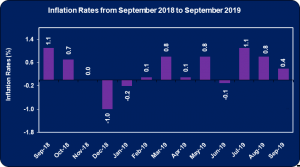 The divisions ‘Miscellaneous Goods and Services’ and ‘Education’ recorded increases of 0.4% and 4.7% in their respective index for September 2019. The former was as a result of increases in “the cost of personal care products and services” while the upward movement in the index ‘Education’ was mainly influenced by “an increase in tuition fees at the beginning of the new school year”.