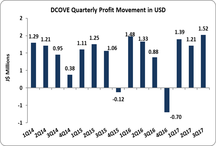 Dolphin Cove (DCOVE) reported Total Revenue of US$13.03 million, an 8% increase when compared to US$12.04 million booked the year prior. Total Revenue for the quarter amounted to US$4.37 million (2016: US$3.93 million). According to the company “In the three-month period of 2017 revenue was up by 11% compared to the three-month period of the prior year and this was assisted by the arrival of cruise ships diverted from other destinations as a result of Hurricane Irma in 2017.The number of visitors to our parks increased by 3% over the prior nine-month period.”