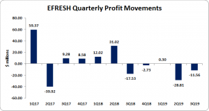 No tax was booked for the nine months ended September 30, 2019, whereas taxation of $8.27 million was charged a year before. Consequently, net loss amounted to $40.07 million compared to net profit of $25.50 million for the corresponding period in 2018. However, for the third quarter a net loss of $11.56 million was booked compared to a net loss of $17.53 million in the previous year. EFRESH stated, “the traditional distribution segment of the Company continues to thrive with a pre-tax profit of $36.7 million for the nine months representing an increase of 9.0% over the $33.8 million earned for the comparative nine months of the previous year. However, the Meat Processing made a loss of $76.8 million for the first nine months of 2019. Therefore, the Company made an overall loss of $40.1 million for the nine months ended 30 September 2019. This is mainly a result of the underutilisation of meat Processing Plant as the gross margins are yet at the breakeven point.”