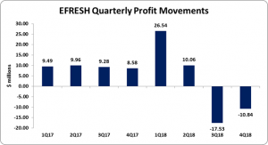 Consequently, earnings per share (EPS) amounted to $0.01 (2017: $0.05) while loss per share for the quarter amounted to $0.014 versus an EPS of $0.011 in 2017. The number of shares used in this calculation was 780,000,000 shares. EFRESH stock price closed the trading period at a price of $1.90 on February 14, 2018.