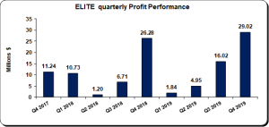 Earnings per share (EPS) for the year totaled $0.15 (2018: $0.13). EPS for the fourth quarter amounted to $0.08 (2018: $0.07). The number of shares used in our calculations mounted to 353,400,000 units. ELITE’s stock price closed the trading period on September 27, 2019, at $5.32.