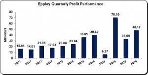 Eppley recorded a total of $10.55 million for share of net profit from joint venture accounted for using the equity method for the period relative to the $17.16 million recorded for the corresponding period in FY2018.