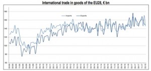 European Union, or EU28 exports of goods in February 2018 was €149.2 billion, up by 1.7% compared with February 2017 (€146.7 billion). Imports from the rest of the world stood at €145.9 billion, down by 0.4% compared with February 2017 (€146.5 billion). As a result, the EU28 recorded a €3.3 billion surplus in trade in goods with the rest of the world in February 2018, compared with a €0.2 billion surplus recorded in February 2017.