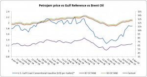 Figure 1: Petrojam, U.S.  Gulf Coast Conventional Gasoline Regular and Brent Crude Oil 1 Year Price History