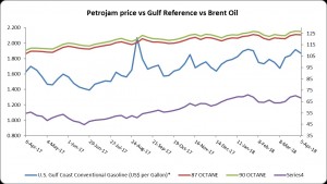 Figure 1: Petrojam, U.S. Gulf Coast Conventional Gasoline Regular and Brent Crude Oil 1 Year Price History