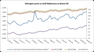Figure 1: Petrojam, U.S. Gulf Coast Conventional Gasoline Regular and Brent Crude Oil 1 Year Price History