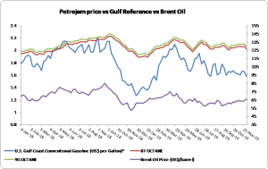 Figure 1: Petrojam, U.S. Gulf Coast Conventional Gasoline Regular and Brent Crude Oil Price History