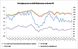 Figure 1: Petrojam, U.S. Gulf Coast Conventional Gasoline Regular and Brent Crude Oil Price History