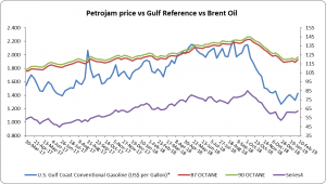 Figure 1: Petrojam, U.S. Gulf Coast Conventional Gasoline Regular and Brent Crude Oil 1 Year Price History