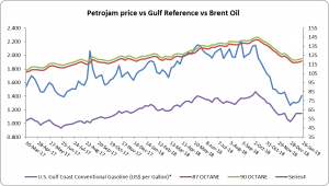Figure 1: Petrojam, U.S.  Gulf Coast Conventional Gasoline Regular and Brent Crude Oil 1 Year Price History