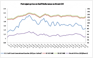 Figure 1: Petrojam, U.S. Gulf Coast Conventional Gasoline Regular, and Brent Crude Oil Price History