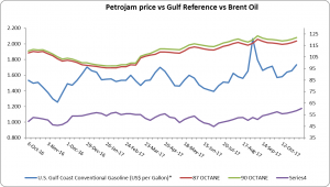 Figure 1: Petrojam, U.S. Gulf Coast Conventional Gasoline Regular and Brent Crude Oil 1 Year Price History