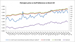 Figure 1: Petrojam, U.S. Gulf Coast Conventional Gasoline Regular and Brent Crude Oil 1 Year Price History