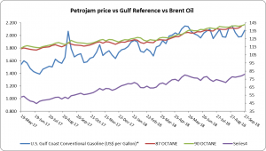 Figure 1: Petrojam, U.S. Gulf Coast Conventional Gasoline Regular and Brent Crude Oil 1 Year Price History