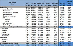 Total Expenditure for the period April to November 2019 amounted to $393.53 billion, $12.10 billion or 3.0% less than the budgeted $405.63 billion. Recurrent expenditure which totalled $360.37 billion, accounted for 91.58% of overall expenditures. Relative to projections, recurrent expenditure was $6.68 billion (1.8%) less than budgeted. Of the recurrent expenditure categories for the review period, all categories were below the budgeted amount. ‘Programmes’ which amounted to $136.69 billion, was $3.25 billion or 2.3% less than projected. Whereas, ‘Compensation of Employees’ which amounted to $141.04 billion was $654.2 million or 0.5% less than projected. In addition, ‘Employee Contribution’ totalled $10.21 billion, 4.6% less than the budgeted amount of $10.71 billion. Wages & Salaries’ amounted to $130.82 billion and was $157.2 million or 0.1% less than projected.