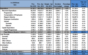 Total Expenditure for the period April to October 2019 amounted to $350.74 billion, $6.52 billion or 1.8% less than the budgeted $357.26 billion. Recurrent expenditure which totalled $319.47 billion, accounted for 91.09% of overall expenditures. Relative to projections, recurrent expenditure was $5.69 billion (1.8%) less than budgeted. Of the recurrent expenditure categories for the review period, all categories were below the budgeted amount except ‘Wages and Salaries’. ‘Programmes’ which amounted to $118.64 billion, was $2.63 billion or 2.2% less than projected. Whereas, ‘Compensation of Employees’ which amounted to $123.65 billion was $274.30 million or 0.2% less than projected. In addition, ‘Employee Contribution’ totalled $9.04 billion, 4.5% less than the budgeted amount of $9.40 billion. However, Wages & Salaries’ amounted to $114.61 billion and was $150.80 million or 0.1% more than projected.