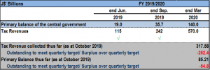 As part of the Memorandum of Economic and Financial Policies (MEFP), the GOJ estimates that the primary balance, as a performance criterion, should amount to $140.01 billion by the end of the 2019/2020 fiscal year. Up to the September quarter, a primary balance of $35.70 billion was estimated. As at the end of October 2019, this amounted to $85.21 billion. Tax Revenue is expected to total an estimate of $570 billion by the end of the March quarter. The reported tax revenue for the end of October 2019 was $317.58 billion.