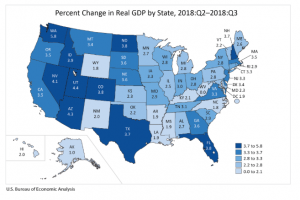 Real GDP in the 3rd quarter of 2018 increased for 49 states and the District of Columbia. According to the U.S. Bureau of Economic Analysis (BEA), “The percent change in real GDP in the third quarter ranged from 5.8 percent in Washington to 0.0 percent in West Virginia.”