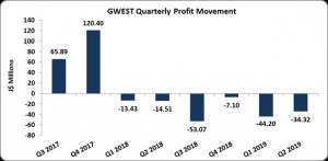 Loss per share (LPS) for the quarter amounted $0.071 (LPS: 2017: $0.028). LPS for the six month period totalled $0.16 relative to an LPS of $0.06 in 2017. The trailing twelve-month LPS amounted to $0.29. The number of shares used in the calculations is 484,848,485. GWEST last traded on November 14, 2018 at $1.90.