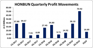 Administrative expenses has rose 15% to $231.56 million (2018: $202.08 million), while Selling, distribution & promotion expenses increased by 16% to $190.32 million (2018: $164.13 million). Total Expenses for the nine months amounted to $421.88 million, 15% above the $366.21 million recorded for the same period of 2018. For the quarter, total expenses increased by 12% to $153.69 million (2018: $136.62 million). HONBUN stated that the growth was, “due mainly to increased sales and marketing spend as well as staff training and development costs.”