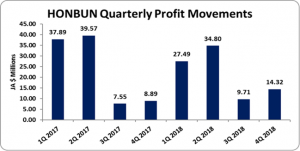 Consequently, Earnings per share (EPS) amounted to $0.18 (2017: $0.20) for the year end, while for the fourth quarter the EPS totaled $0.03 (2017: $0.02). The number of shares used in this calculation was 471,266,950 shares. HONBUN last traded on November 29, 2018 at $4.02.