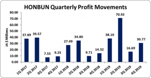 Consequently, Earnings per share (EPS) amounted to $0.33 (2018: $0.18) for the year end, while for the fourth quarter the EPS totaled $0.07 (2018: $0.03). The number of shares used in this calculation was 471,266,950 shares. HONBUN last traded on November 29, 2019 at $6.58.