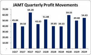 Consequently, earnings per share totaled $0.15 compared to $0.13 for the period ended March 2019. For the quarter, EPS closed at $0.08 (2018: $0.06). The trailing earnings per share amounted to $0.31. The numbers of shares used in the calculations are 686,033,460 units. JAMT last trade d on May 15, 2019 at $4.09.