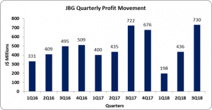 Consequently, Earnings per share for the nine months ended January 31, 2108 amounted to $1.14 (2017: $1.30). The trailing twelve months earnings per share amounted to $1.70. The total number of shares used in the calculations amounted to 1,199,276,400 units. Earnings per share for the quarter amounted $0.61 relative to the $0.60 recorded for same quarter in 2017. Notably, JBG’s stock price closed the trading period on March 8, 2018 at a price of $18.51