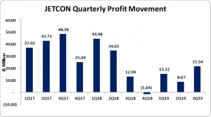 Jetcon Corporation Limited (JETCON), for the nine months ended September 30, 2019 reported a 16% decline in turnover to $747.25 million (2018: $892.29 million). However, turnover for the quarter amounted to $280.08 million relative to $288.29 million in 2018, a 3% decline year over year.
