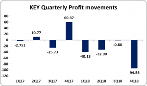 Loss per share (LPS) for the quarter amounted to $0.24 relative to earnings per share of $0.16 in 2017. The LPS for the year totalled $0.45, relative to an EPS of $0.12 booked in the year before. KEY last traded at $3.70 as at June 27, 2019. The number of shares used in the calculation was 368,460,691 units.