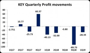 Loss per share (LPS) for the quarter amounted to $0.08 relative to earnings per share of $0.11 in 2018. The trailing twelve months earnings per share totalled $0.41. KEY last traded at $3.90 as at May 17, 2019. The number of shares used in the calculation was 368,460,691 units.