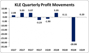 Earnings per share for the three month ended March 31, 2019 amounted to $0.002, while for the corresponding quarter of 2018, a loss per share of $0.02 was recorded. The twelve month trailing LPS is $0.24. The number of shares used in our calculations is 100,000,000. KLE’s stock price closed on May 20, 2018 at $2.40.