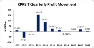As September 30, 2017, assets totaled $2.61 billion, $419.88 million more than the $2.19 billion booked as at September 30, 2016.  The company stated that “Investment Properties remain the largest component of Kingston Properties’ balance sheet assets. As at September 30, 2017, investment properties amounted to $2,519.3 million versus $1,932.1 million at the end of the first nine months of 2016. The increase is primarily as a result of additions to the portfolio during January 2017 and this represents a year over year increase of 30.4%. In 2017, the portfolio composition by geography is as follows: US (53%), Jamaica (34%) and Cayman (13%). This compares with US (70%) and Jamaica (30%) in 2016.”