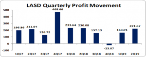 Net Profit for the period closed at $385.58 million (2018: $463.72 million), a 17% decline year over year. As for the second quarter, Net Profit fell 4% to $221.67 million (2018: $230.08 million). LASD noted that, “the six months comparative decline in profit was heavily attributable to restructuring expenses and legal fees associated with ongoing matters including the Pfizer case and investment in our route to market.” Total Comprehensive Income for the first six months totalled $400.84 million (2018: $463.72 million).