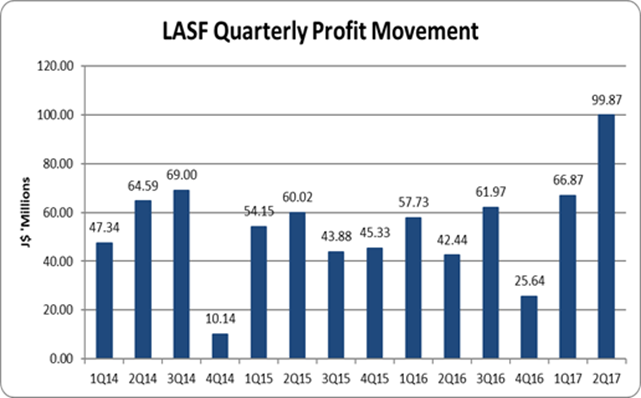 LASF recorded trading income of $681.28 million; this represented a growth of 35% when compared to $506.21 million posted in 2016, while trading income for the quarter amounted to $378.6 million (2016: $268.73 million). Other income amounted to $33.93 million, an increase of 28% (2016: $26.52 million), this resulted in overall income of $715.22 million, a growth of 34% compared to $532.73 million for the corresponding period in 2016. Overall revenue growth for the quarter was $396.0 million (2016: $272.08 million). The company stated that “The second quarter revenues normally benefit from increased summer transactions, but this year, in particular, the investments in expansion which were put in place from the previous year began yielding the intended results. Additionally, there are new revenue streams in place this year which were not in place in the previous year, namely, our Montego Bay full-service branch and new additions to our agent network.”