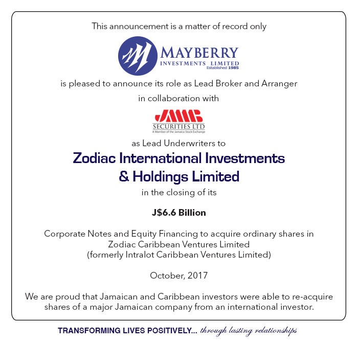 Mayberry Investments Limited acts as lead broker and arranger to Zodiac International Investments & Holdings Limited