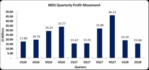 Earnings per share for the period amounted $0.13 (2017: $0.12). EPS for the quarter amounted to $0.06 relative to $0.06 in 2017. The trailing twelve-month EPS amounted to $0.429. The number of shares used in the calculations is 263,157,895. MDS last traded on November 12, 2018 at $ 8.00.